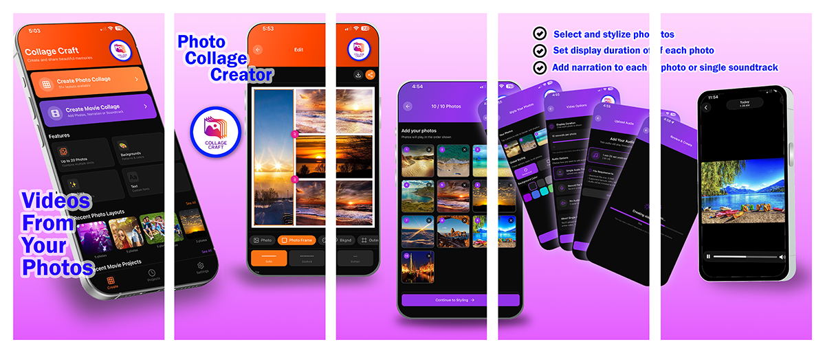 The first app to offer voice-narrated video collages. Transform static photos into dynamic short-form videos.